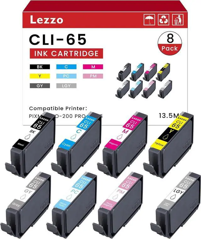 CLI-65 Ink Cartridge 8-Pack CLI65 Ink Replacement for Canon CLI-65 CLI65 Ink for PIXMA PRO-200 PRO-200S Printer (BK, C, M, Y, GY, PC, PM, LGY)