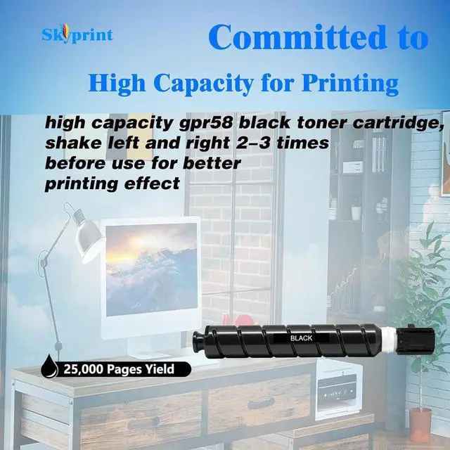 SkyPrint GPR-58 toner cartridges come with intelligent chips that automatically recognize and provide printing, Not damaging the machine Shake the toner cartridge horizontally 2-3 times before use to evenly distribute the toner