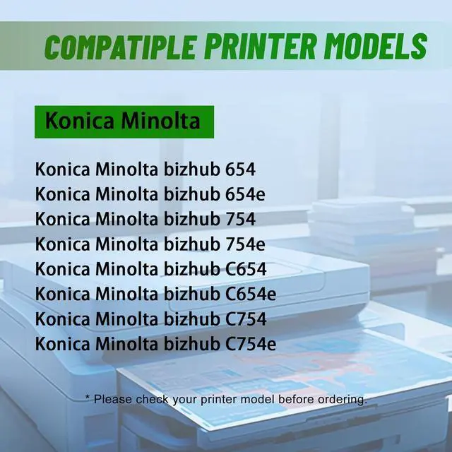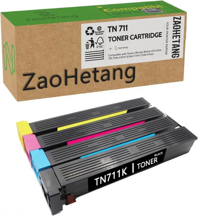 Package contains: TN711 1x black 1x cyan 1x magenta 1x yellow toner cartridge.Compatible with: Konica Minolta Bizhub 654 654e 754 754e C654 C654e C754 C754e.Page yield: Up to 43,000 pages per black cartridge and Up to 28,000 pages per color cartridge (at 5% coverage, Letter,A4).