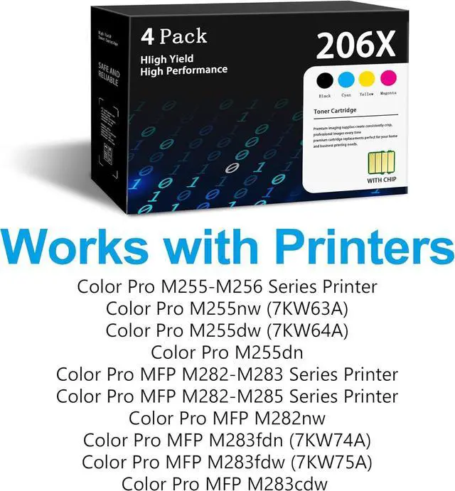 This Item206X Toner Cartridges 4 Pack Replacement for HP 206X 206A Toner Cartridges 4 Pack Color MFP M283fdw M283cdw M283 Pro M255dw M255 Printer Ink 206X | W2110X W2111X W2112X, W2113XRecommendations206X Toner Cartridges Replacement for HP 206X Toner Cartridges 4 Pack High Yield for Color Pro MFP M283fdw M282nw M283fdn Pro M255dw M255nw | W2110X W2111X W2112X W2113X 206X Toner Cartridges 4 Pack Compatible for MFP M283fdw M283cdw for HP 206X 206A 206 HP206X HP206A Toner Work for Color Laser Jet Pro MFP M283fdw M255dw MFP M283cdw MFP M283fdn MFP M282nw M255nw Ink 206X Toner Cartridges 4 Pack High Yield - (with Chip) Replacement for HP 206A 206X Color Pro MFP M283fdw M283cdw M283fdn M282nw Pro M255dw M255dn M255nw Printer Ink 206X Toner Cartridges 4 Pack High Yield Replacement for HP 206X 206A Toner Works with Color Pro MFP M283fdw M283cdw M255dw, Pro MFP M283 M282 M255 Series Printer with Chip | Black Cyan Magenta Yellow 204X Black Cyan Magenta Yellow Toner Cartridge 4 Pack Replacement for HP 204X 204A Toner Cartridges Color Pro M154a M154nw MFP M180n M181fw M181fdw M180nw Printer | CF510X CF511X CF512X CF513X
