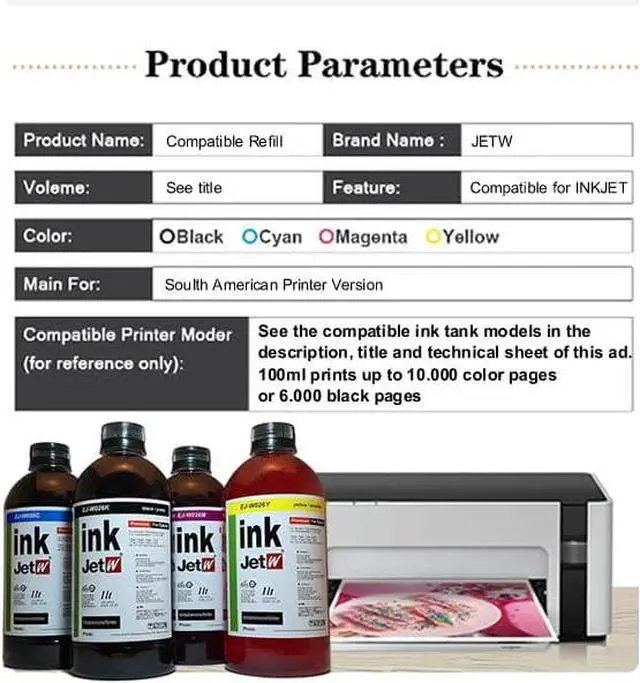 We are there whenever you need us. 24 hour technical support. Any defective ink can be returned or exchanged. Package Contents: 4 x compatible for epson 522 black ink. ( NON-OEM ink ) Compatible Printers: JETW Compatible Refill Ink Bottle Replacement for Epson Ecotank T502 ET-4760 ST-4000 ET-2760 ET-4850 ET-3843 ET-3830 ET-2850 ET-2700 ET-3710 ET-4850 ET-3850 ET-3750 ET-2750 ET-15000 ST-C4100 ET-3700 ET-4760 ST-C2100 ET-4750 ET-2850 ET-4750 ST-3000 ET-3760 ST-2000 ET-2750 Printer. Page Yield: Up to 86,000 pages per Compatible for epson 522 black ink, Up to 86,000 pages per Compatible for color ecotank 522 ink bottles. ( at 5% coverage on A4 paper) The Compatible 522 ink refill bottle is subjected to rigorous installation tests at the factory to ensure High compatibility with the Ecotank printer. Compatible with the ink epson 522. The JETW Compatible 522 ink combo pack provides excellent printing results. Vibrant and long-lasting colors and clear text. Gives you a different experience.