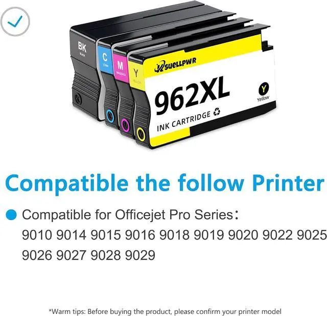 Ink 962XL Compatible Printers: OfficeJet Pro 9010 9014 9015 9016 9018 9019 9020 9022 9025 9026 9027 9028 9029 9015e 9025e 9018e 9012e 9010e 9014e 9019e 9020e 9022e 9028e printer