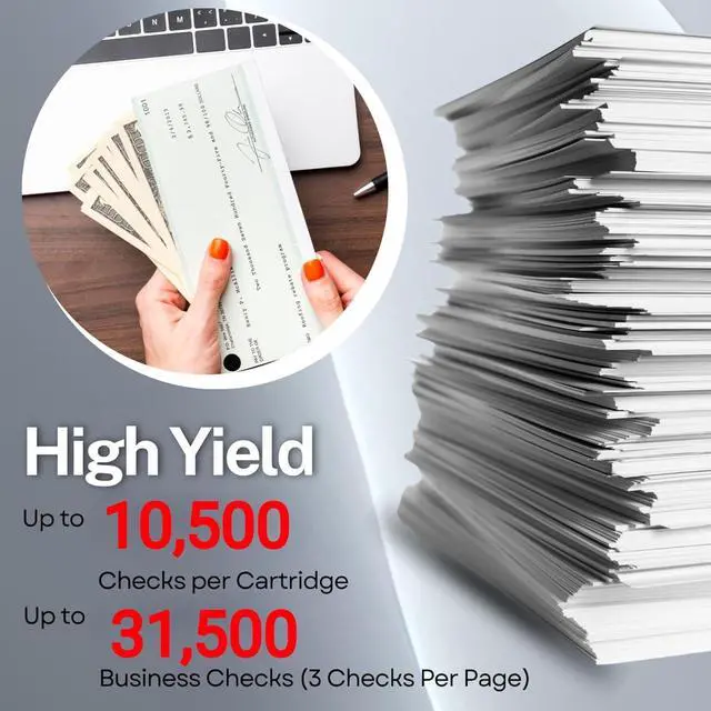 HIGH YIELDBased on the industry-standard 5% coverage, our high-yield cartridges will produce 10,500 single checks or 31,500 business checks at 3 per page.