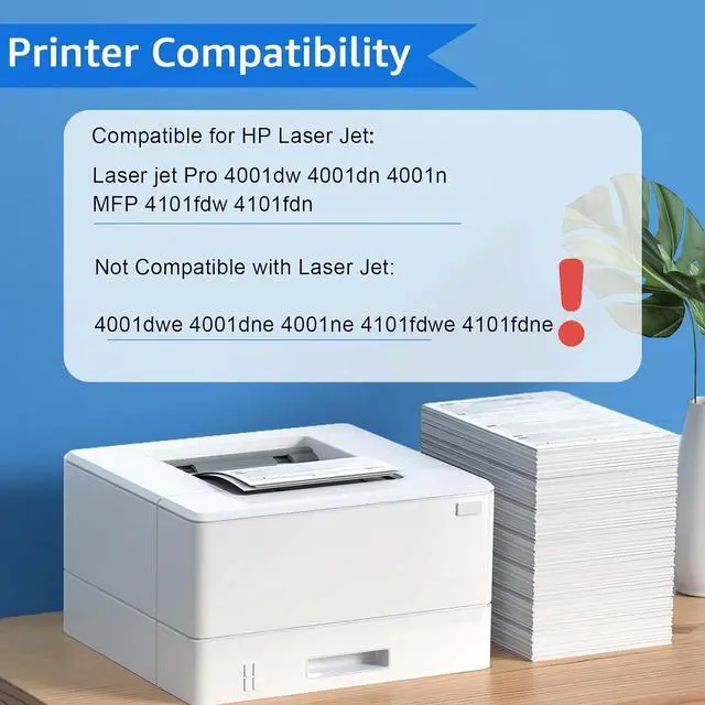Packing Contents: 1 Pack 148X W1480X Black Toner Cartridge Replacement compatible for HP 148X. Compatible for HP Printers: Laser Jet 4001dw 4001dn 4001n MFP 4101fdw 4101fdn.