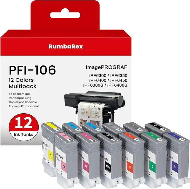 The Package Contains: PFI-106 Ink Cartridge 12 Pack (Matte Black, Black, Cyan, Magenta, Yellow, Photo Cyan, Photo Magenta, Red, Green, Blue, Gray, and Photo Gray) each with a capacity of 130 ml.