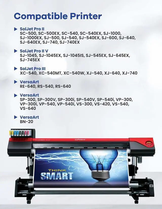 Compatible with ROLAND: SolJet Pro II SC-500, SC-500EX, SC-540, SC-540EX, SJ-1000, SJ-1000EX, SJ-500, SJ-540, SJ-540EX, SJ-600, SJ-640, SJ-640EX, SJ-740, SJ-740EX, SolJet Pro II V SJ-1045, SJ-1045EX, SJ-1045IS, SJ-545EX, SJ-645EX, SJ-745EX, SolJet Pro III XC-540, XC-540MT, XC-540W, XJ-540, XJ-640, XJ-740, VersaArt RE-640, RS-540, RS-640, VersaCAMM SP-300, SP-300V, SP-300i, SP-540V, SP-540i, VP-300, VP-300i, VP-540, VP-540i, VS-300, VS-420, VS-540, VS-640, VersaStudio BN-20;