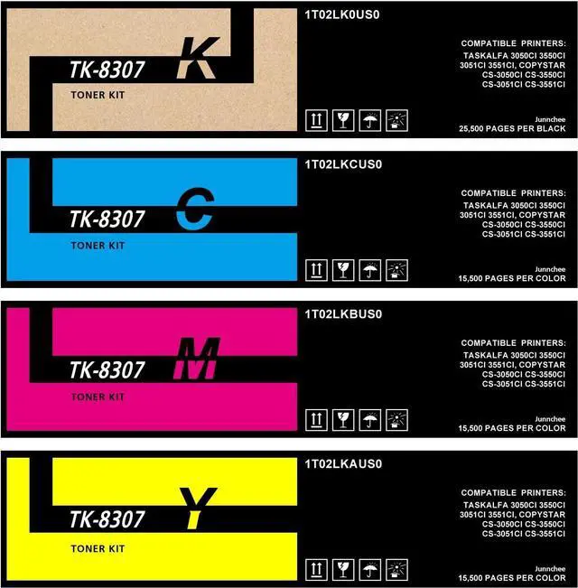 This ItemJunnchee TK-8307 TK8307 Toner Cartridge Replacement for TK-8307K TK-8307C TK-8307M TK-8307Y for Mita Taskalfa 3050ci 3550ci 3051ci 3551ci Printer (1T02LK0US0 1T02LKCUS0 1T02LKBUS0 1T02LKAUS0, 4-Pack)RecommendationsYiBoton TK-8307 TK8307 High Capacity Toner Cartridge TK-8307K TK-8307C TK-8307M TK-8307Y Toner Compatible for Taskalfa 3050ci 3550ci 3051ci 3551ci Printer(4-Pack) SCCOLOR TK-8307 TK8307 Toner Cartridge High Capacity 4Pack Compatible TK-8307K TK-8307C TK-8307M TK-8307Y Toner Cartridge Replacement for Kyocera TASKalfa 3050ci 3550ci 3051ci 3551ci Printers MasaiMara TK-8307 TK8307 High Yield Toner Cartridges Replacement for Kyocera Taskalfa 3050ci 3550ci 3051ci 3551ci Printer TK-8307K TK-8307C TK-8307M TK-8307Y Black, Cyan, Magenta, Yellow, 4-Pack SAIBOYA Compatible TK-8307 TK8307 Toner Cartridge Use in Kyocera Mita TASKalfa 3050ci 3550ci 3051ci 3551ci Copystar CS3050ci CS3550ci CS3551ci CS3051ci Printers (BK, C, M, Y, 4-Pack) SkyPrint TK-8307 TK8307 Toner Cartridge Black Cyan Magenta Yellow Compatible with Kyocera TK-8307 Toner for use Ink Kyocera TASKalfa 3050ci 3550ci 3051ci 3551ci Printers