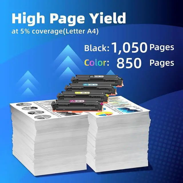 High Page Yield 1,050 pages 215A W2310A black toner and 850 pages 215A W2311A W2312A W2313A per color toner (5% coverage on A4 paper)