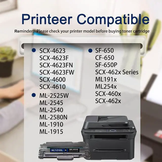 This Item[1-Pack, Black] MLT-D105L D105L Toner Cartridge Compatible Replacement for Samsung SCX-4623 4623F 4623FN 4623FW 4600 4610 460x ML-2525W 2545 2580N 1910 191x 254x SF-650 650P CF-650 PrinterRecommendationsLD Compatible Toner Cartridge Replacement for Samsung MLT-D105L High Yield (Black) Compatible with Samsung ML Printers ML-2525W ML-2525 ML-2580n ML-1915 ML-1910 ML- MM MUCH & MORE Compatible Toner Cartridge Replacement for Samsung 105L D105L MLT-D105L to Used with ML-2525 ML-2525W ML-1910 ML-1915 ML-2540 SCX-4623F SCX-4623FN SCX-4623FW Printers (Black, 1 Pack) Inktoneram Compatible Toner Cartridges Replacement for Samsung D105L MLT-D105L MLTD105L SCX-4600 SCX-4623F SCX-4623FN SF-650 SF-650P ML-1910 ML-1915 ML-2525 ML-2525W ML-2545 ML-2580N (Black, 2-Pack) MLT-D105L D105L Toner Cartridge Replacement for Samsung MLTD105L 105L to Use with ML-2545 ML-2540 ML-2580N SCX-4623 SCX-4623F Printer Toner(Black, 2 Pack)