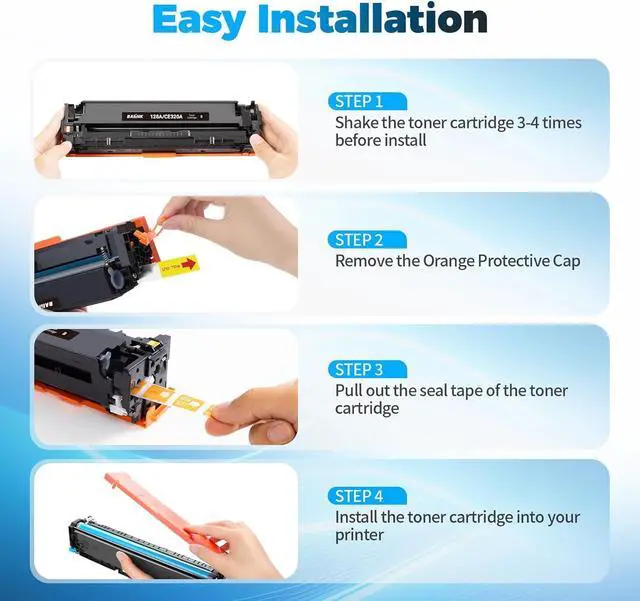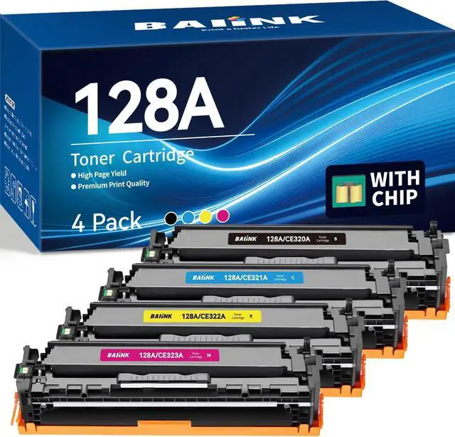 Package Contents: 4 pack Replacement for hp 128a toner cartridges (1 CE320A Black,1 CE321A Cyan,1 CE322A Yellow,1 CE323A Magenta)