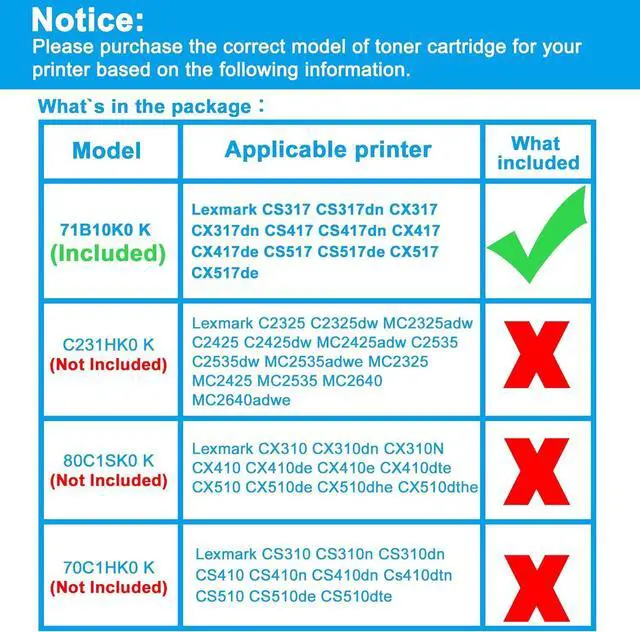 This ItemLCL Remanufctured Toner Cartridge Replacement for Lexmark 71B0010 71B10K0 CS317 CS317dn CX317 CX317dn CS417 CS417dn CX417 CX417de CS517 CS517de CX517de CX517 (1-Pack Black) TonerRecommendationsGREENBOX Remanufactured 71B10 71B0010 Toner Cartridge Replacement for Lexmark 71B0010 71B10K0 71B10C0 71B10M0 71B10Y0 for CS317 CS417 CS317dn CX317dn CS417dn CX417de Printers, 4 Packs, High-Yield MEGOFFICE Compatible Toner Cartridge Replacement for CS317 CS417 for Lexmark 71B1HK0 71B1HC0 71B1HM0 71B1HY0 High Yield 71B0H10 71B0H20 71B0H30 71B0H40 CX417 CS517 CX517 CS317dn CX317dn (4-Pack) 71B0010 Toner Cartridge High-Yield (4-Pack) CX317dn Toner Replacement for Lexmark 71B10K0 71B10C0 71B10M0 71B10Y0 for CS317dn CX317dn CS417dn CX417de CS517de CX517de CX628de CX629de Printer SANCTink Remanufactured Toner Cartridge Replacement for Lexmark CS317 CS417 CS417dn CX317 CX317dn CX417 CS317dn CS517 CX517 CX417de 71B10K0 71B10C0 71B10M0 71B10Y0 71B0010 (High Yeild, 4-Pack) VICTORSTAR 4 Colors Compatible Toner Cartridges CS317 CX317 CS417 CX417 CS517 CX517 Standard Capacity 3000 Pages BK, 2300 Pages CMY for Lexmark Printer CS317dn CX317dn CS417dn CX417de CS517de CX517de