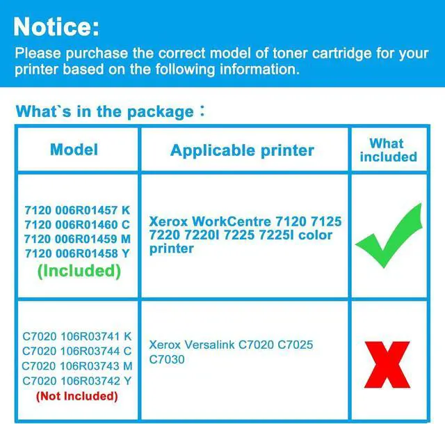 Toner Cartridge (Black) Toner Cartridge (Cyan) Toner Cartridge (Magenta) Toner Cartridge (Yellow) 4.4 out of 5 starsLCL Compatible Toner Cartridge Replacement for Xerox WorkCentre 7120 7125 7220 7220I 7225 7225I 006R01457 006R01460 006R01459 006R01458 (4-Pack Black Cyan Magenta Yellow)