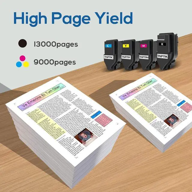 • Package Content: 1*TNP79K (AAJW130) Black toner cartridge, 1*TNP79C (AAJW430) Cyan toner cartridge, 1*TNP79Y Yellow (AAJW230) toner cartridge, 1* TNP79M (AAJW330) Magenta toner cartridge,TOTAL 4 PACK cartridges.