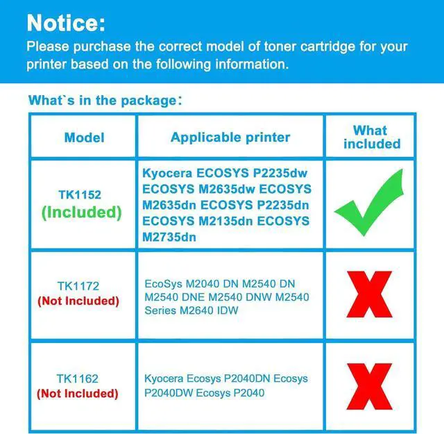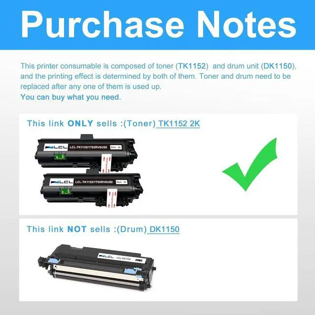 This ItemLCL Compatible Toner Cartridge Replacement for Kyocera TK1152 TK-1152 1T02RV0US0 ECOSYS P2235dw M2635dw M2635dn P2235dn M2135dn M2735dn(2-Pack Black)RecommendationsLCL Compatible Toner Cartridge Replacement for Kyocera TK5152 TK-5152 TK5152K TK-5152K 1T02NS0US0 ECOSYS M6035cidn M6535cidn P6035cdn (2-Pack Black) LCL Compatible Toner Cartridge Replacement for Kyocera TK132 TK-132 1T02HS0US0 FS-1028mfp FS-1128mfp FS-1300D FS-1350DN (1-Pack Black) LCL Compatible Toner Cartridge Replacement for Kyocera TK5242 TK-5242 TK5242K TK-5242K 1T02R70US0 for Kyocera ECOSYS M5526cdn M5526cdw P5026cdn P5026cdw Printer (2-Pack Black) LCL Compatible Toner Cartridge Replacement for Kyocera TK5232 TK-5232 TK5232K TK-5232K 1T02R90US0 for Kyocera ECOSYS M5521cdn M5521cdw P5021cdn P5021cdw Printer (1-Pack Black) LCL Compatible Toner Cartridge Replacement for Kyocera TK3122 TK-3122 1T02L10US0 ECOSYS FS-4200DN M3550idn (1-Pack Black)