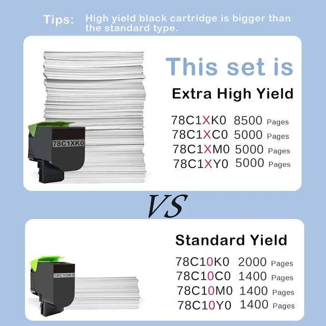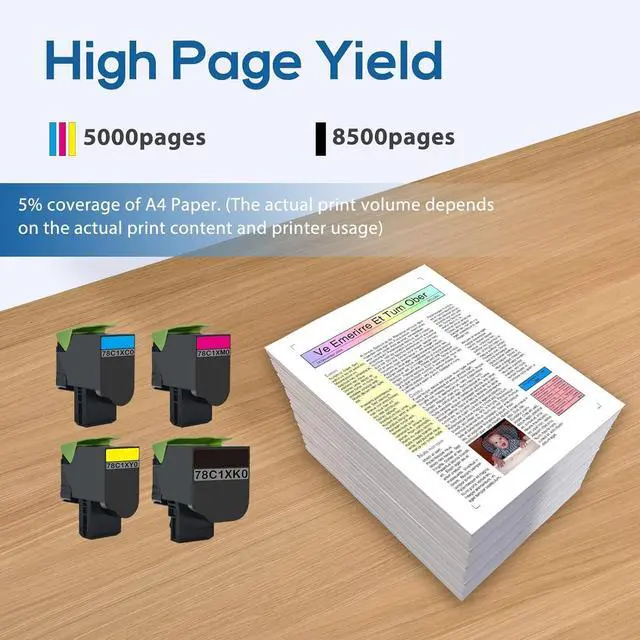 THIS IS HIGH PAGES TYPE: 8500 pages per 78C1XK0 Black toner cartridge, 5000 pages per 78C1XC0/ 78C1XM0/78C1XY0 color toner cartridge at 5% coverage of A4 Paper. (depends on printer and usage) TOTAL 4 PACK cartridges.