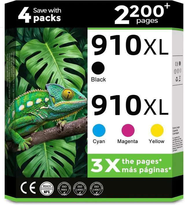 What's in the box: 1 New Extra Capacity Cartridge 910 pack of 4 ink cartridges: 910XL Black ink cartridge for hp printer, 910XL Cyan, Magenta, and Yellow ink cartridge for hp printer and a user guide
