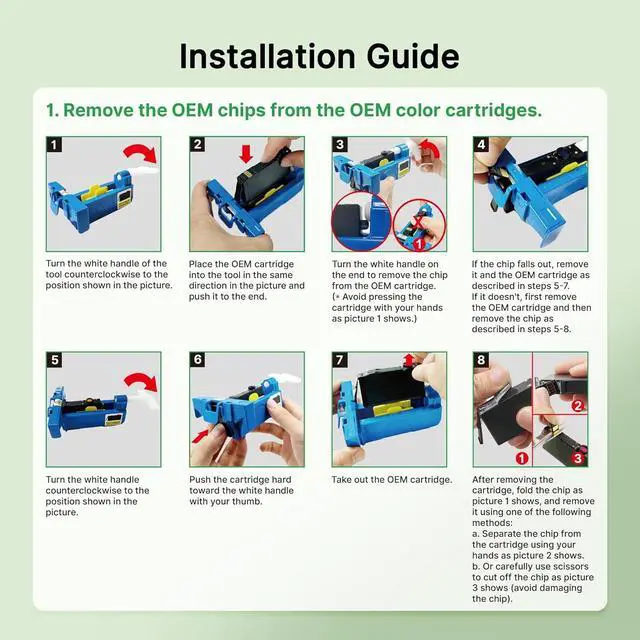 Chip Replacement Guide: You need to remove the original chips on ink cartridges through our tool. Peel off the tape of the new compatible cartridge and Stick the chip onto the tape