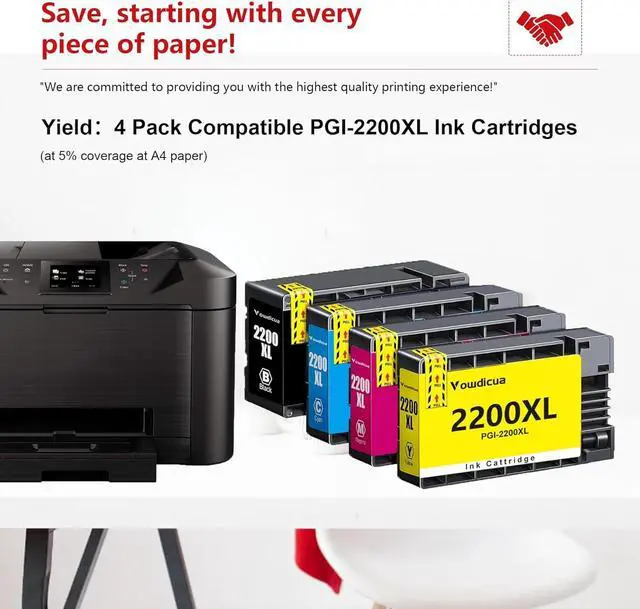 • Number of sheets printed: PGI-2200XL Black Ink up to 2500 Pages,each Ink Cartridges is compatible with PGI 2200XL color ink up to 2200 Pages. (At 5% coverage on A4 paper) Choosing our PGI2200XL can greatly save time to replace the ink