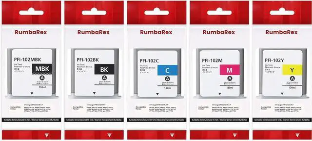 The Package Contains: PFI-102 Ink Cartridge 5-Pack (Matte Black, Black, Cyan, Magenta, Yellow) each with a capacity of 130 ml