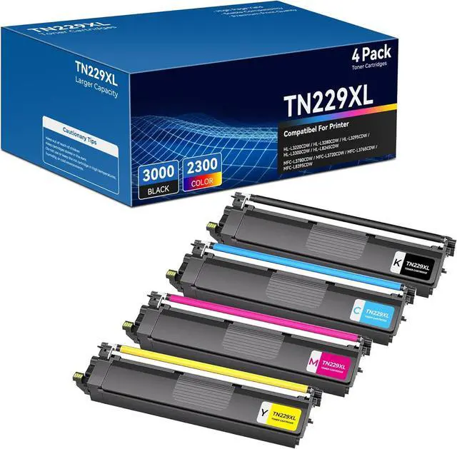 Package Includes: 229 xl toner compatible for Brother 229xl toner cartridges 4 pack ( 1 x tn-229xl black toner, 1 x tn-229xl cyan toner, 1 x tn-229xl yellow toner, 1 x tn-229xl magenta toner).