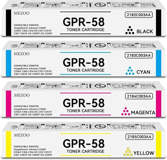 This ItemGPR-58 GPR58 Toner Cartridge Compatible for Canon ImageRunner Advance C256 C256iF C356 C356iF DX C257 C257iF DX C357 C357iF Printers DX-C359IF DX-C259IF Printer(4-Pack, Black Cyan Magenta Yellow)RecommendationsMEGOFFICE Compatible Toner Cartridge Replacement for GPR-58 GPR58 High Yield for Canon ImageRunner Advance iR-ADV C256 C256iF C356 C356iF DX C257 C257iF C357 C357iF (4 Pack, Black Cyan Magenta Yellow) High Yield GPR58 GPR-58 XL Black Toner Cartridge Compatible for Canon ImageRunner Advance C256 C256iF C257 C257iF C356 C356iF C357 C357iF Printers (1 Pack) GPR58 GPR-58 Black Toner Cartridge Compatible Canon GPR-58 Toner Replacement for Canon ImageRunner Advance C256 C256iF C257 C257iF C356 C356iF C357 C357iF Printer(1-Pack) GPR58 Toner Cartridge Compatible for Canon GPR-58 Toner for Canon ImageRunner Advance iR-ADV C256 C256iF C356 C356iF DX C257 C257iF C357 C357iF DX-C359IF DX-C259IF Printer High Yield GPR-58 GPR58 Toner Cartridge for Canon Imagerunner Advance iR-ADV C256 C256iF C257 C257iF C356 C356iF C357 C357iF Printers (Black Cyan Magenta Yellow)
