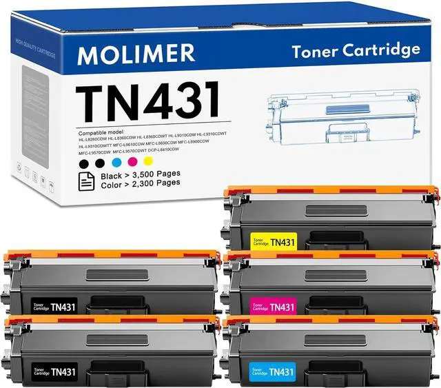 Package Contents: 2 x Black TN431BK Toner, 1 x Cyan TN431C Toner, 1 x Magenta TN431M Toner, 1 x Yellow TN431Y Toner (5 Pack)