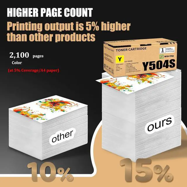 • Estimated Page Yield: 2,100 pages high resolution print per CLT-Y504S(SU506A) Yellow Toner Cartridge at 5% coverage.