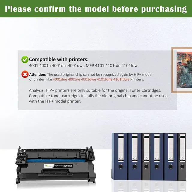 This Item2 Packs 148A W1480A (NO CHIP with Tool) Compatible Toner Cartridges Standard Capacity 2900 Pages for H P Laserjet Pro 4001 4001n 4001dn 4001dw 4101fdn 4101fdw Printer, Doesn't Work with H P+ PrintersRecommendations148A Toner Cartridge (with Chip) Compatible Replacement for HP 148A 148X W1480A W1480X Toner Cartridge Works with HP Pro 4001dw 4001dn 4001n MFP 4101fdw 4101fdn Printer (1 Black) INK E-SALE 148A Toner Cartridge Black (with Chip) Compatible Replacement for HP 148A 148X W1480A W1480X for HP Laserjet Pro MFP 4101fdw 4101fdn 4001dw 4001dn 4001n Printer (1 Pack) 148A Toner Cartridge Black 148X Compatible Replacement for HP W1480A W1480X MFP 4101fdw 4101fdn Pro 4001dw 4001dn 4001n Printer Ink (2 Pack with Chip) 148A Toner Cartridge Black (with Chip) Compatible Replacement for HP 148A W1480A 148X W1480X Work for MFP 4101fdn 4101fdw 4001dn Laserjet Pro 4001dw 4001n Printer (2 Pack) 148A W1480A Black Toner Cartridge Set 2-Pack High Yield with Chip Replacement for HP 148A W1480A 148X W1480X Cartridges Compatible with HP Laserjet Pro MFP 4101fdw 4101fdn 4001dw 4001dn 4001n Printer