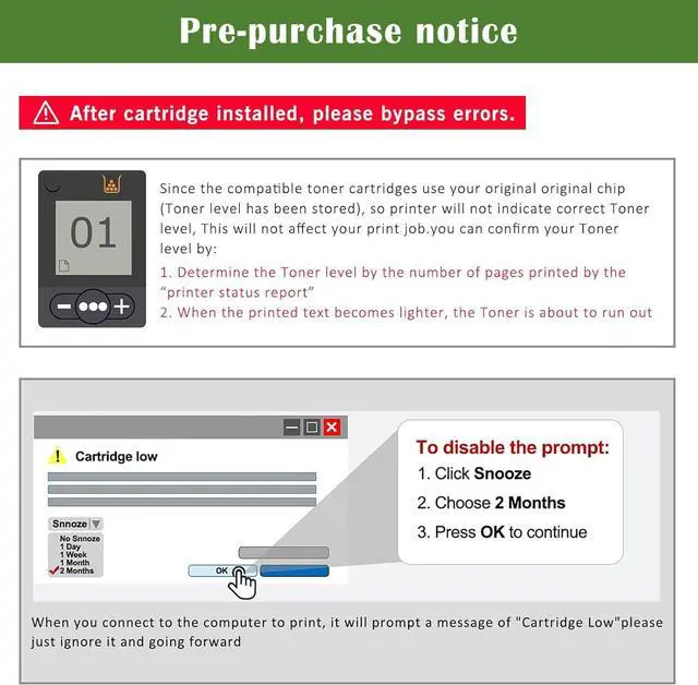 Page yield: Standard capacity, 2900 pages for Black.Yield Condition: 5% coverage, A4 paper, letter. (ISO/IEC standard).Quality period: 12 months.Preserving Method: General requirements in 10 to 30 degrees Celsius temperature, relative humidity 20-80%.We use quality toner and brand new shells.There is no back-grounding and compatibility issues on printing.Toner doesn't have bad smell, it is pure, fresh and natural.