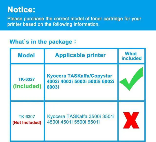 Toner Cartridge Page 11Previous pageNext pageLCL TK-6327 TK-6329 Black Toner Cartridge Replacement for Kyocera TK-6327K TK-6329K 1T02NK0US0 1T02NK0CS0 for 4002i 4003i 5002i 5003i 6002i 6003i CS4002i CS4003i CS5002i CS5003i CS6002i CS6003i (1PK)