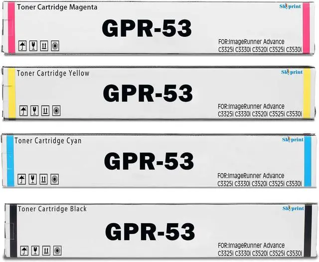 This ItemGPR53 GPR-53 Toner Cartridges Compatible for Canon ImageRunner Advance C3325i C3330i C3520i C3525i C3530i Printer. GPR53 Black Cyan Yellow MagentaRecommendationsGPR-55 GPR55 High Yield Toner Cartridge Black Cyan Magenta Yellow Replacement for Canon GPR-55 GPR55 Toner Cartridge for ImageRunner Advance C5535i C5540i C5550i C5560i Printer (4 Pack) GPR53 GPR 53 Toner Cartridge 4-Pack (Black Cyan Magenta Yellow) Replacement for Canon GPR-53 Toner Cartridge for ImageRunner Advance C3325 C3325i C3330 C3330i C3525i C3530i Printer Ink GPR-53 GPR53 Toner Cartridge High Yield Replacement for Canon GPR53 Toner ImageRunner Advance C3325i C3330i C3525i C3530i C3025i C3725i C3730i C3826i C3830i C3835i Printer (Black Cyan Magenta Yellow) MasaiMara GPR-53 GPR53 Toner Cartridge for Canon ImageRunner Advance C3020 C3320 C3320F C3320L C3325 C3325i C3330 C3520 C3520i C3525 C3525i C3530 C3530i Printer (Black, Cyan, Yellow, Magenta, 4-Pack) GPR61 GPR-61 High Yield Toner Cartridge Black Cyan Magenta Yellow Compatible with Canon ImageRunner Advance DX C5840i C5850i C5860i C5870i Printer(4-Pack)