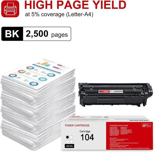 2,500 pages per 104 Black Toner Cartridge (Based on up to 5% coverage)