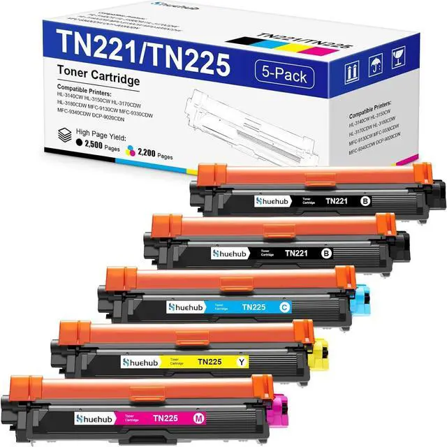 Package Contents: 2 x Black TN221BK, 1 x Cyan TN225C, 1 x Magenta TN225M, 1 x Yellow TN225Y, 5 Pack TN221 TN225 Toner Cartridges