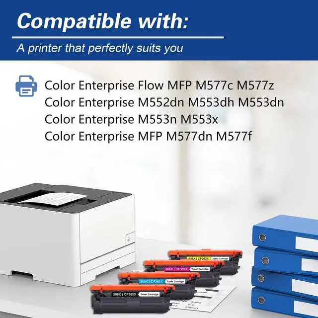 This Item508X Toner Cartridges (4-Pack) High Yield Replacement for HP 508X 508 Color Enterprise M553 M553dh M553dn M553n M553x M552dn MFP M577dn M577f PrinterRecommendations508X Black High-Yield Toner Cartridges ( 4-Pack ) Replacement for HP 508X 508A Cyan Magenta Yellow Color Enterprise M553 M552 m553dn m553n MFP M577 Series Printer| CF360X CF361X CF362X CF363X 508A Toner Cartridge (1-Pack) High-Yield Replacement for HP Color 508A Toner Black Cyan Magenta Yellow Color Laserjet Enterprise M553 M552 MFP M577 Series (CF360A CF361A CF362A CF363A) 508A Toner Cartridges High Yield (5-Pack, 2 Black/1 Cyan/1 Magenta/1 Yellow) - 508A Toner Cartridge Set Replacement for HP M553 Toner Cartridge Color Enterprise Flow MFP M577c M577z M552dn Pritner LD Products Compatible Toner Cartridge Replacement for (1-Pack, Magenta) HP 201X CF403X High Yield Works with HP Printers M252dw M252n M277c6 M277n MFP M277dw M252dw M252n M277n MFP M277dw