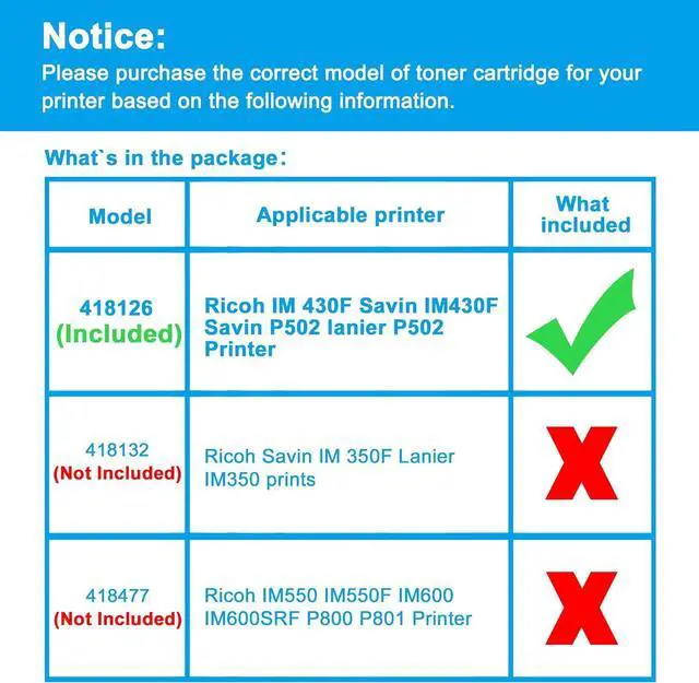 Toner Cartridge Page 11Previous pageNext pageLCL Compatible Toner Cartridge Replacement for Ricoh 418126 IM430 IM430F Savin IM430F Savin P502 High Yield IM 430F Savin IM430F Savin P502 Lanier P502 (1-Pack Black)