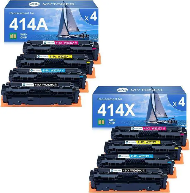 What's in the box: 1x 414X W2020X black toner, 1x 414X W2021X cyan toner, 1x 414X W2022X yellow toner, 1x 414X W2023X magenta toner , 1x 414A W2020A black toner, 1x 414A W2021A cyan toner, 1x 414A W2022A yellow toner, 1x 414A W2023A magenta toner