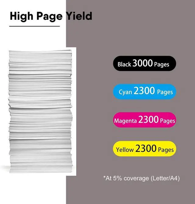 Estimated page yield: High yield 3000 pages per 71B10K0 Black toner cartridge;2300 pages per color toner cartridge(71B10C0 Cyan, 71B10M0 Magenta, 71B10Y0 Yellow) at 5% coverage of A4 Paper. (depends on printer and usage)
