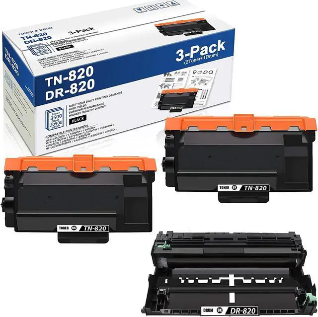 What's in the box?Compatible Toner Cartridges and Drum Unit for TN820 and DR820,3-Pack(2 Toner+1 Drum). What printer model is compatible with? DCP-L5500DN L5600DN L5650DN Printer MFC-L6700DW L6750DW L5700DW L5800DW L5900DW L6800DW L6900DW Printer HL-L6200DW/DWT L6250DW L6300DW L6400DW/DWT L5000D L5100DN L5200DW/DWT Printer Why do you choose our products? Our products can provide you with reliable quality assurance, so that you can use easily and secure. Helps reduce your printing costs,and providing high-value option for high-volume printing. Provide after- service for every customer and ensure that the after- service is worry-free. Our quality assurance: Tested with All compatible printers and easy installation and operation. Advanced production technology ensures clear and high quality images. Applicable scene:home, company, school and other scenarios.