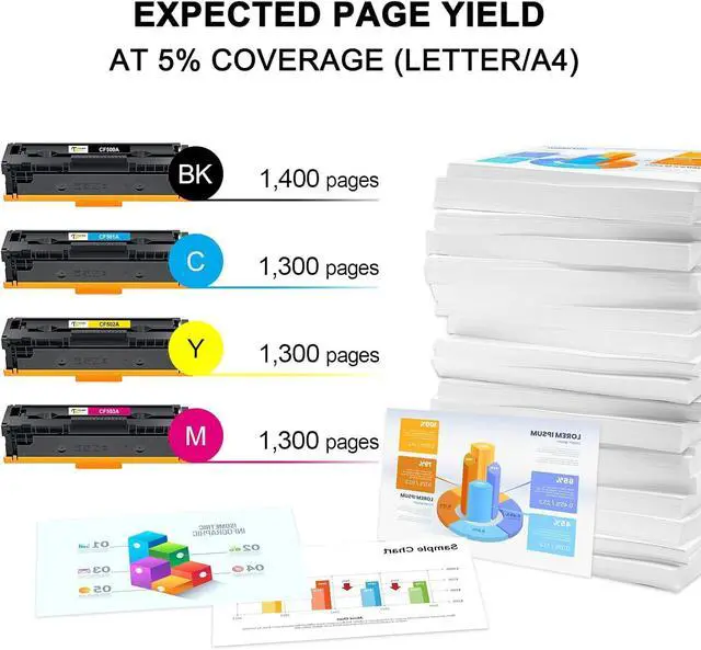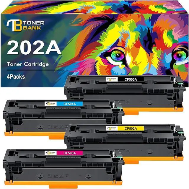 Package includes: 1x CF500A 202A Black | 1x CF501A 202A Cyan | 1x CF502A 202A Yellow | 1x CF503A 202A Magenta (NON-OEM)Page Yield: 1,400 Pages (Black) and 1,300 Pages (Color) at 5% CoverageColor: Black Cyan Yellow Magenta