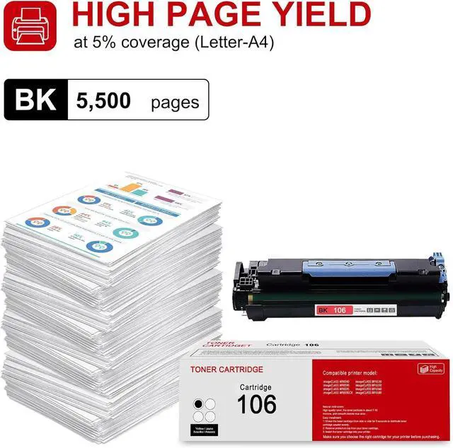 5,500 pages per 106 Black Toner Cartridge (Based on up to 5% coverage)