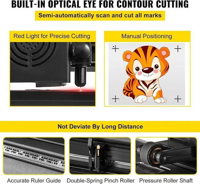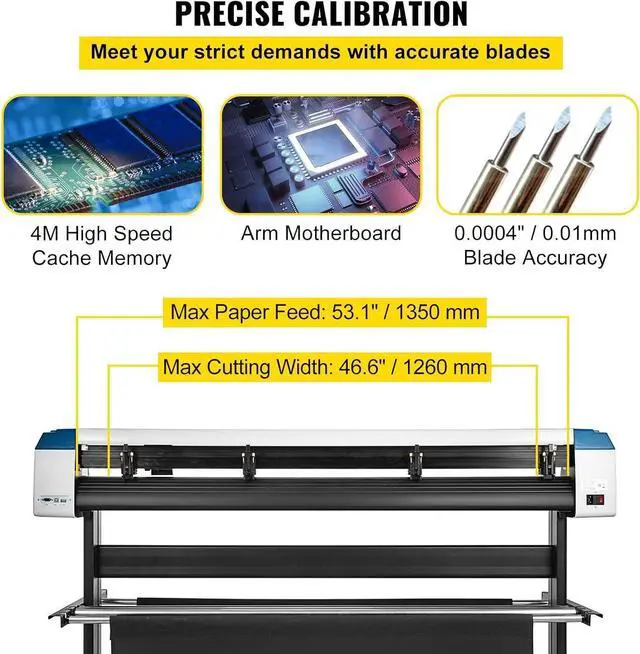 Precise Cutting: This vinyl cutter includes three replaceable blades and a precise dividing ruler, enjoying a good reputation for its incredibly sharp and accurate performance. Max Cutting Width: 49.6 in / 1260 mm; Max Paper Feed: 53.1 in / 1350 mm; Cutting Precision: +/- 0.0004 in / 0.01 mm, definitely meeting your multiple requirements.