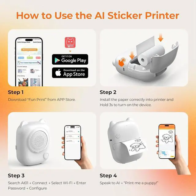 Voice-Controlled AI Creation for KidsSay ideas out loud and watch them turn into black-and-white stickers with this AI mini printer sticker maker. Using simple voice commands, kids can create stories, drawings, and fun content ready for coloring, collecting, and stickingno typing needed.