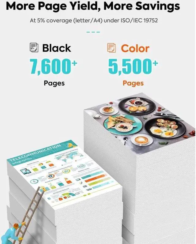 High Printing High Savings: 7600 Pages per Black Toner, 5500 Pages per Color Toner at 5% coverage (Letter/A4).