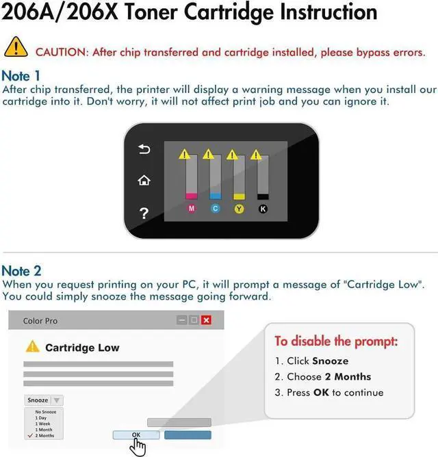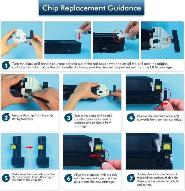 Note: These Compatible 206A cartridges do not have chips. For using, you need to install the Original 206A Toner Chip. Please view the user guide we provided for the specific methods of installing