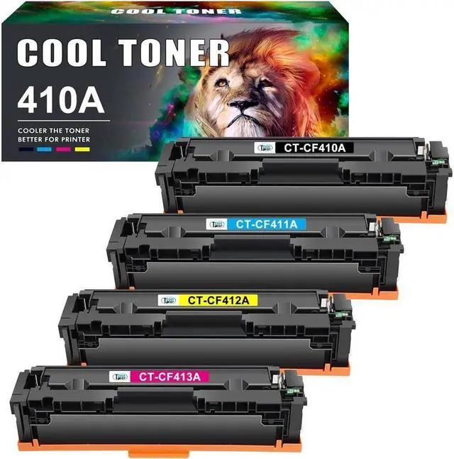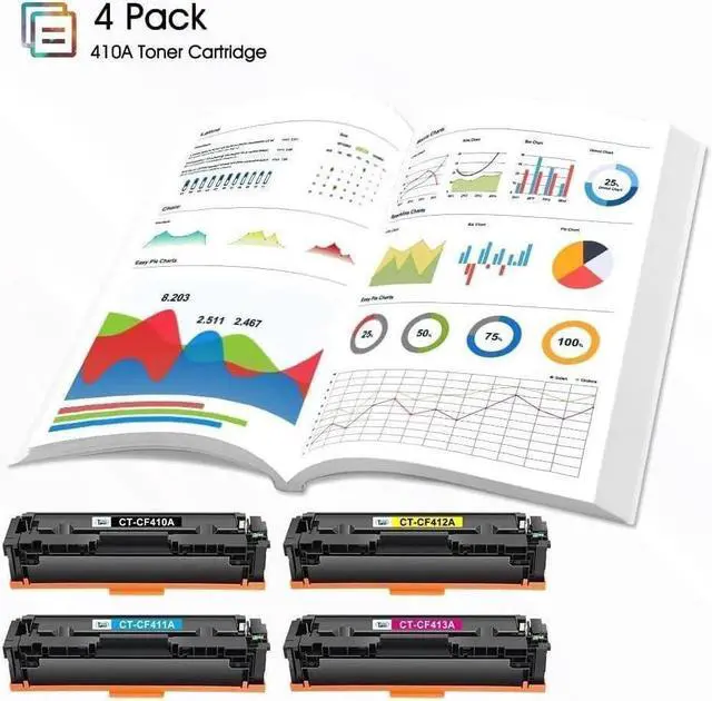 Include: 4 Pack Compatible for 410A toner cartridges in the box: 1 Black (CF410A) 1 Cyan (CF411A) 1 Yellow (CF412A) 1 Magenta (CF413A) toner cartridge