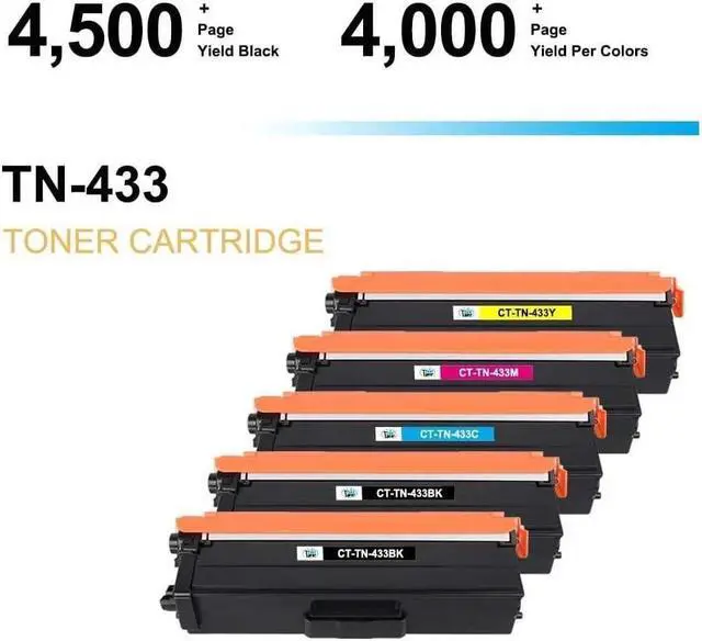 Replacement for OEM: Cool Toner Compatible for Brother TN 433 TN433BK TN433C TN433M TN433Y High Yield Toner Cartridges also Available in Standard Yield TN-431 TN431BK TN-431C TN-431M TN-431Y Toner Cartridges