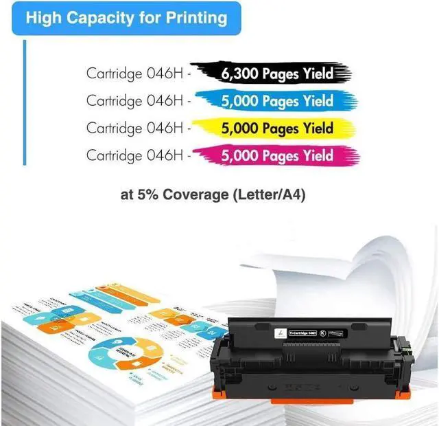 Product Description Read moreRead more 4 Packs Cartridge 046H Toner Cartridge4 Packs Cartridge 046 Toner Cartridge1 Pack Cartridge 046H Black Toner Cartridge5 Packs Cartridge 046H Toner CartridgeItem046 Toner Cartridges & 046H Toner Cartridges046 Toner Cartridges & 046H Toner Cartridges046 Toner Cartridge & 046H Toner Cartridge046 Toner Cartridges & 046H Toner CartridgesColor informationBlack Cyan Yellow MagentaBlack Cyan Yellow MagentaBlackBlack Cyan Yellow MagentaCompatible brandCanonCanonCanonCanonPagesBlack-6, 300 Pages Color-5, 000 PagesBlack-2, 200 Pages Color-2, 300 PagesBlack-6, 300 PagesBlack-2, 200 Pages Color-2, 300 PagesCompatible Printer ModelsImageCLASS MF733Cdw, MF731Cdw, MF735Cdw, LBP654CdwImageCLASS MF733Cdw, MF731Cdw, MF735Cdw, LBP654CdwImageCLASS MF733Cdw, MF731Cdw, MF735Cdw, LBP654CdwImageCLASS MF733Cdw, MF731Cdw, MF735Cdw, LBP654Cdw