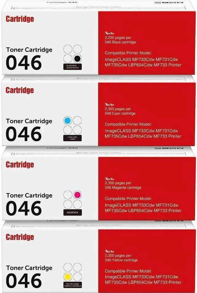 • Package Contents: 4 Pack of Compatible for 046 046H CRG-046 toner cartridge replacement (Black, Cyan, Magenta, Yellow)