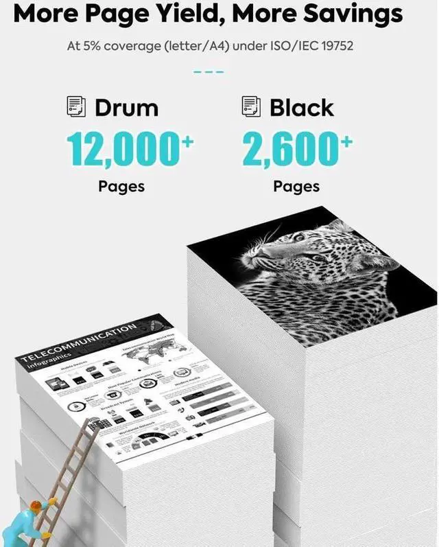 High Printing High Savings: Approximately 12, 000 pages per drum unit and 2, 600 pages per toner cartridge based on 5% coverage (letter/A4).