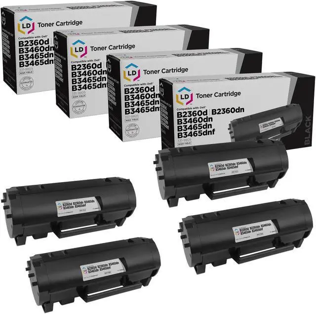 Save and print even more when you shop with LD Products! This offer includes (4) 331-9805 / MX11XH / C3NTP high yield black laser toner cartridges; they replace the 331-9803 / RGCN6 / 7MC5J standard yield black laser toner. Why pay more for brand name Dell toner? These toner cartridges are compatible with Dell Laser B2360d, B2360dn, B3460dn, B3465dn and B3465dnf printers. Please note, retail packaging may vary and this set will only work with printers purchased within the United States and Canada. The use of compatible replacement printing supplies does not void your printer warranty.